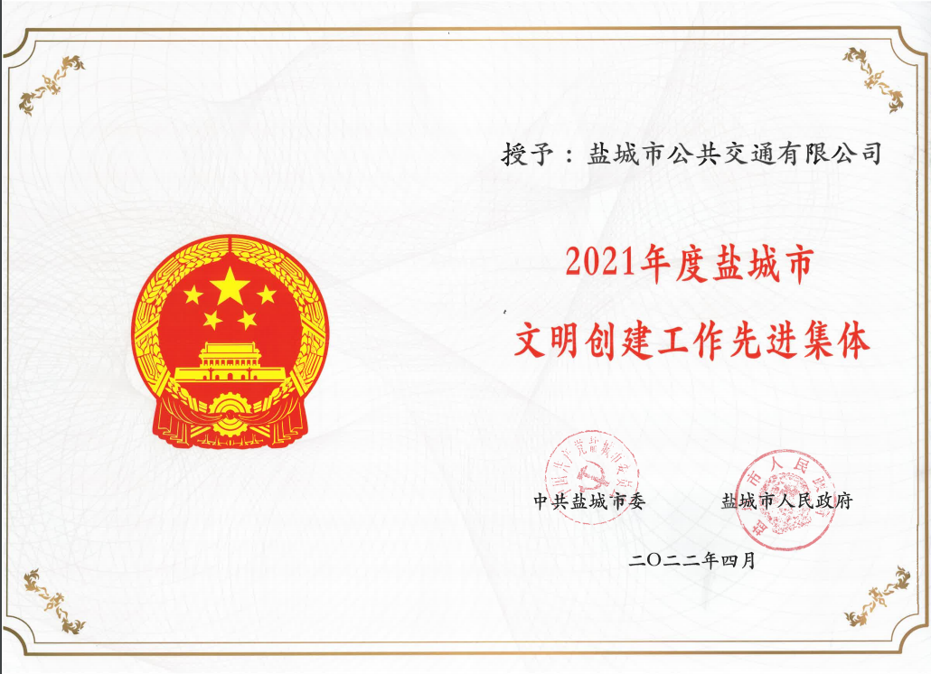 - 2022年4月公司被授予2021年度鹽城市文明創(chuàng)建工作先進(jìn)集體榮譽稱號